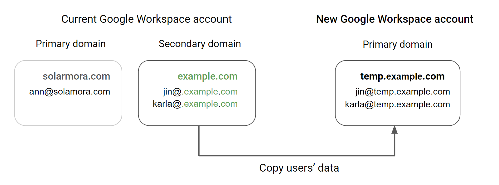 For each user in the secondary domain, you copy their email and files from their current Google Workspaceaccount to their new account. For example, copy email for jin@example.com to jin@temp.example.com